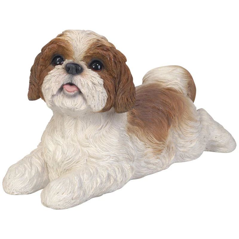 Shih Tzu – This lovable laying shih-tzu ornament depicts a brown and white shih tzu resting on its front, gazing upward with with its tongue poking out. This detailed garden statue mirrors the shih tzu’s small size & long coat.